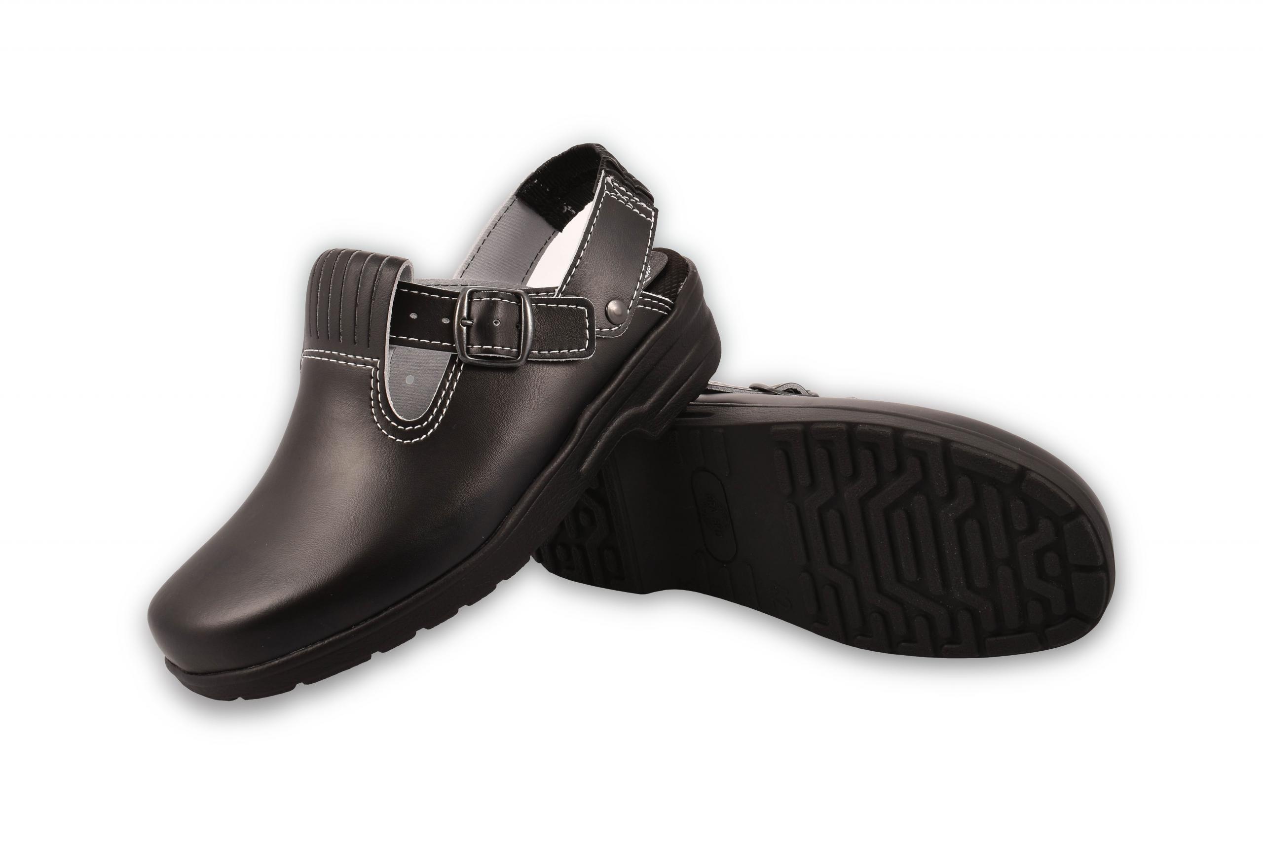 Mjuk och sviktande yrkestoffel (mjuktoffel). Reglerbar vristrem. Kombinerad häl- och vristrem med spänne. Innersula av Cambrelle som formar sig efter foten och ger hög komfort. Innersulan har även ett lager av aktivt kol som reducerar eventuell odör. Ovandel i PU-beklätt skinn som stöter bort fukt och smuts. Yttersula i lätt PU som är halkreducerande.